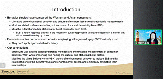 张曼老师首先向参会者介绍了王红教授的科研和工作经历。王红教授任职于普渡大学农业经济系,本科毕业于清华大学,博士毕业于密歇根州立大学农业经济系。王红教授的研究领域包括多国消费者行为、食品安全、电商、商品市场、农业风险与保险、农村发展、环境和农业的作用关系等,她目前研究多关注于食物的消费者偏好,特别是采用实验方法研究中国消费者的食物偏好。王红教授已在同行认可期刊发表120余篇学术论文,同时是Food Policy和China Agricultural Economic Review的联合主编,并将于2023年担任Food Policy联合执行主编。