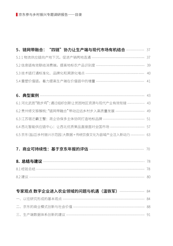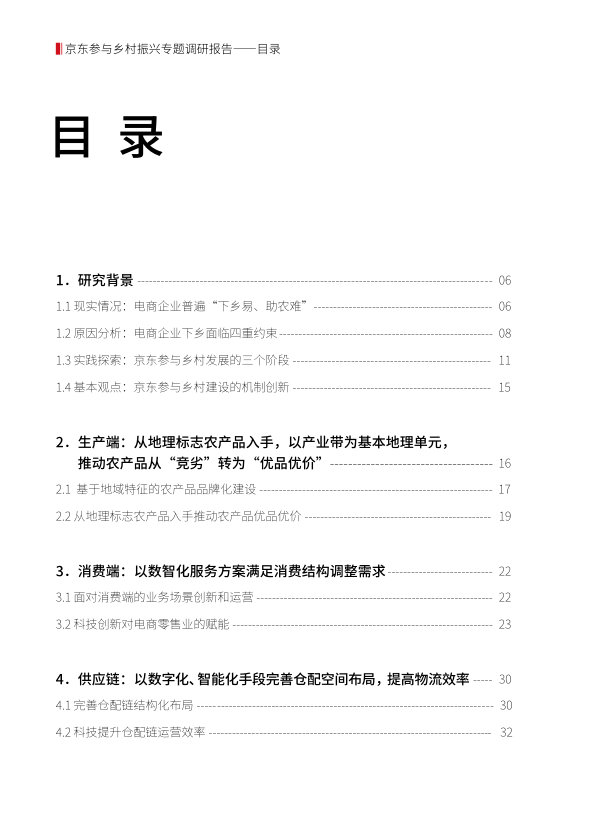 在内容结构上,报告首先分析了电商企业下乡的一般困境;其次,从生产端、消费端、供应链、信息链、技术链、价值链等方面归纳了京东通过科技研发、仓配链网建设、基层组织创新等手段克服企业与小农户之间交易成本过高等问题的主要经验做法;第三,通过五个案例对京东与河北武邑、贵州修文、江苏宿迁、新疆伽师、四川盐边等地合作进行乡村振兴的模式创新进行了具体介绍;最后,结合京东实践和经验分析,就推动农业供给侧与金融供给侧改革有机结合、通过数字技术创新推动非标准化的生态农业发展等方面提出了若干建议。