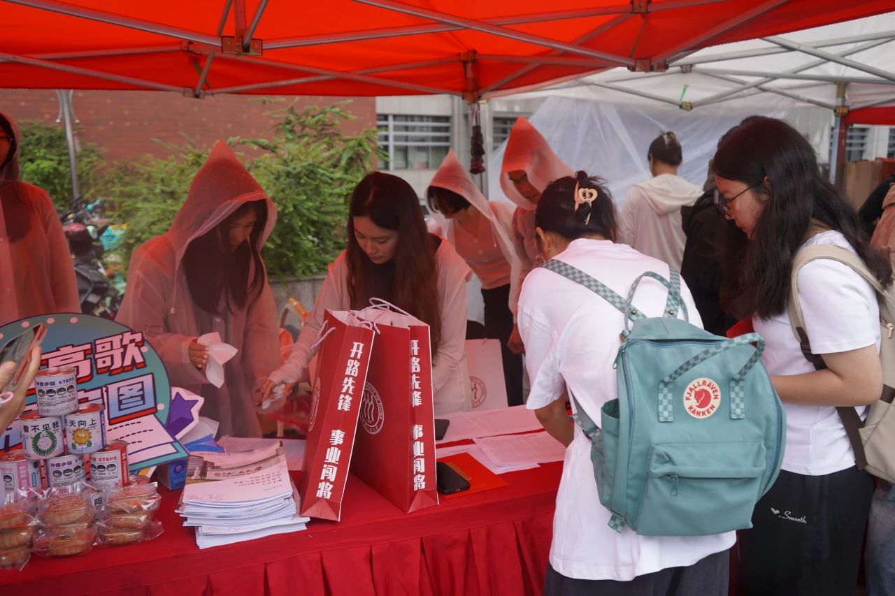 报到台,指导迎新工作并与报到的学生热情交谈。